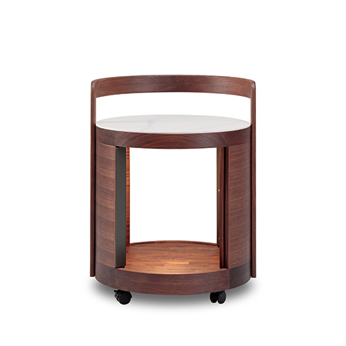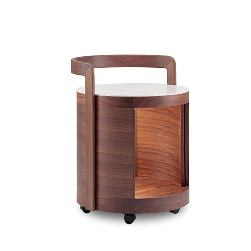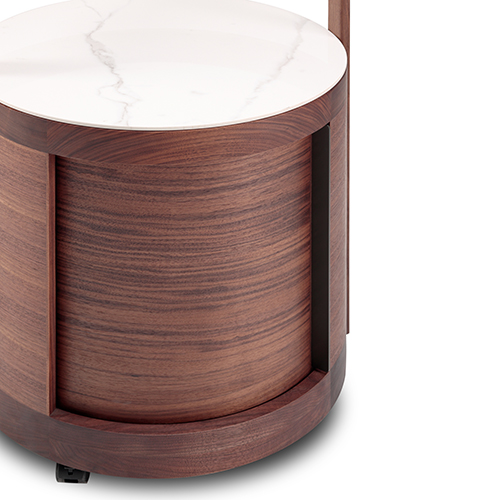 圓柱造型別致、空間占地面積小、陶瓷巖板精致漂亮、多層實木板特殊曲面工藝打造的柜體、感應燈設計方便靈活。